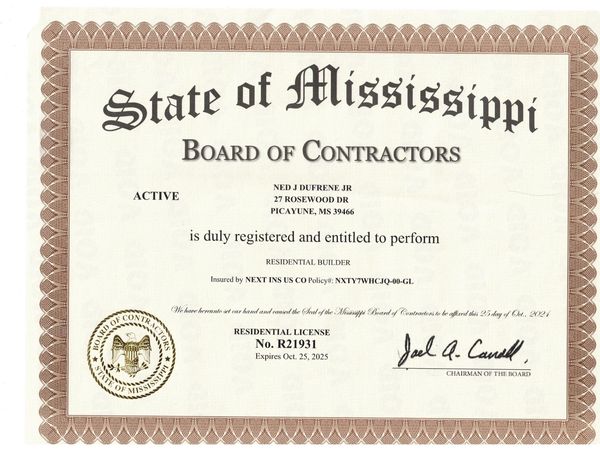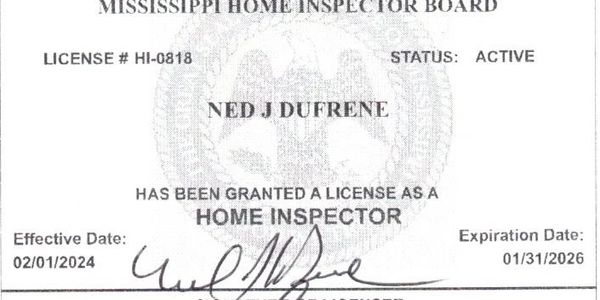 Dufrene Property Inspections is a sole proprietorship providing personalized and comprehensive home inspection services. I am a licensed Home Inspector in Louisiana (LHI 11141) and Mississippi (MHID 0818 (NH)), as well as a licensed Residential Builder in Mississippi (MBOC R21931). Additionally, I am an ICC Certified Residential Building Inspector (ICC 10344784), professionally trained, fully insured and committed to upholding the highest standards in both new construction and pre-owned home inspections. An affiliate member of the GULF COAST ASSOCIATION OF REALTORS® and InterNACHI® trained, I remain dedicated to ongoing professional development and continuous training.